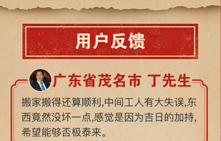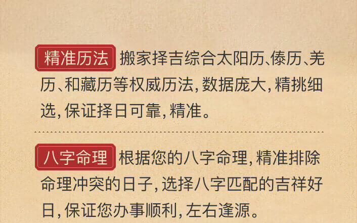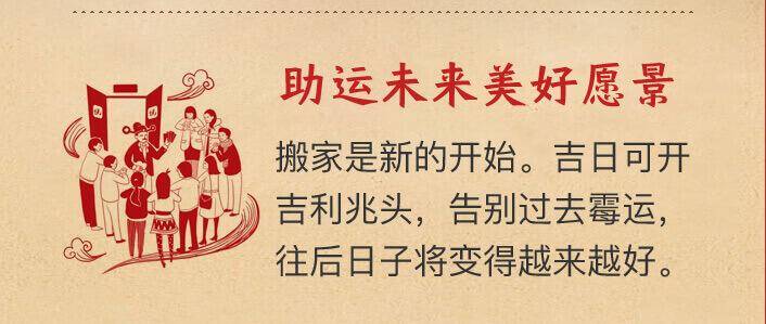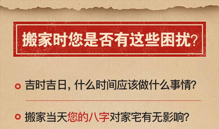 俗话说,“吉地也要良辰催”。自古以来,选择个好日子就是搬家迁居前必做的准备。在适合自己的吉日搬迁,有益助旺家运昌盛不衰。